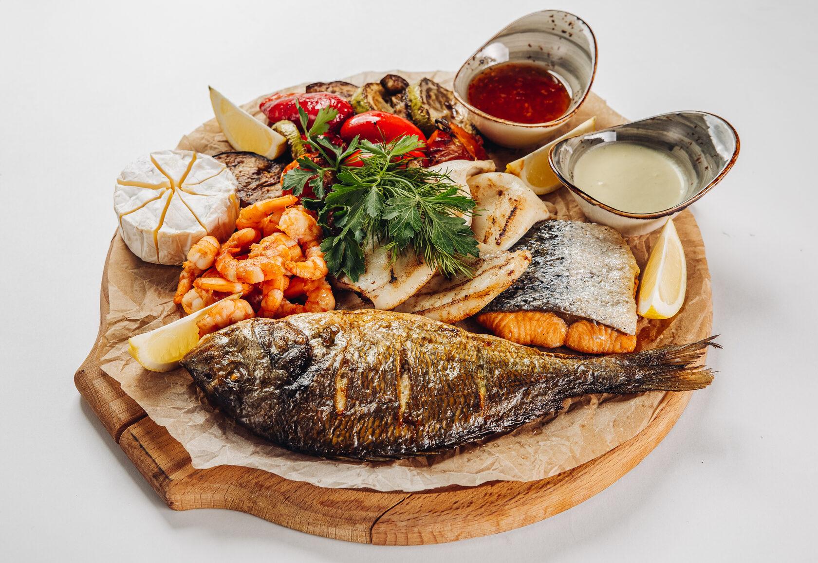 Тигровые креветки, кальмар, дорадо, лосось, баклажан, цукини, перец болгарский, помидор, соус тар-тар, соус свит чили, лимон, зелень