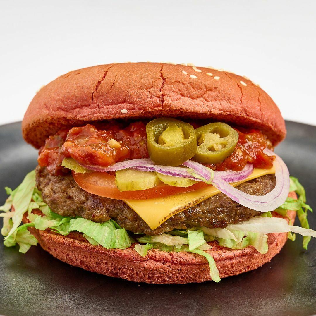 Чили булочка, котлета из говядины, сыр чеддер, халапеньо, салат айсберг, жареный бекон, картофель фри, помидор, огурец соленый, соус сырный, лук красный, соус сальсачили булочка, котлета из говядины, сыр чеддер, халапеньо, салат айсберг, помидор, маринованный огурец, лук красный, соус сальса