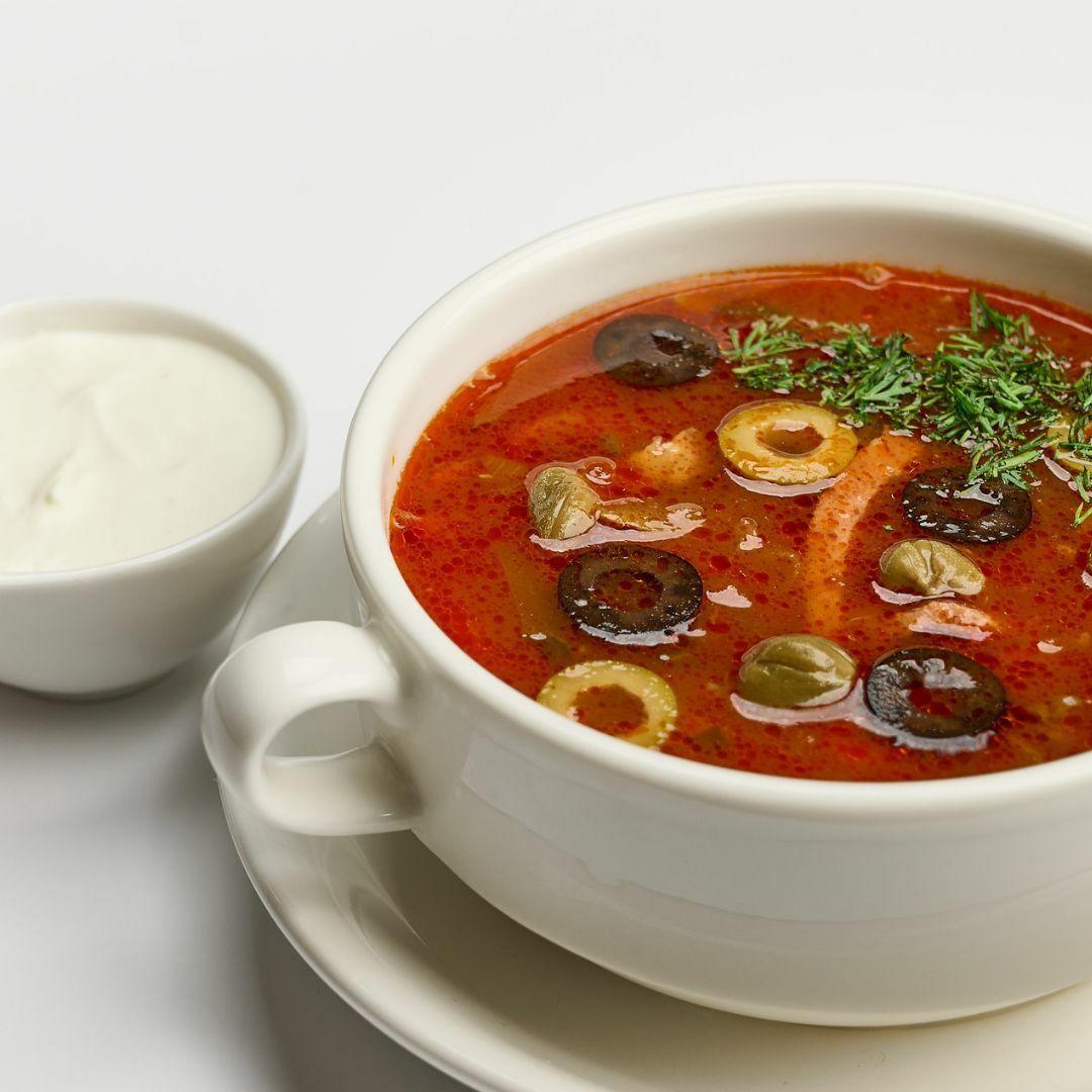 Охотничьи колбаски, сервелат, буженина, оливки, маслины, каперсы, лук репчатый, соленые огурцы, подается со сметаной
