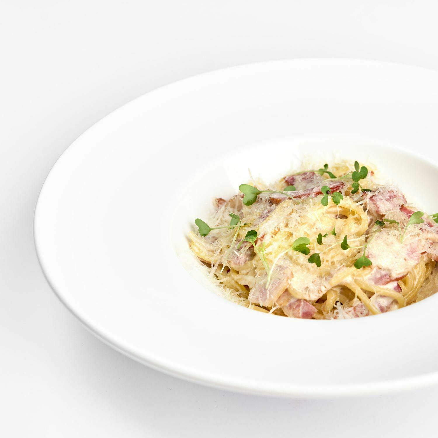 Спагетти , бекон, сливки, сыр пармезан, куриное яйцо