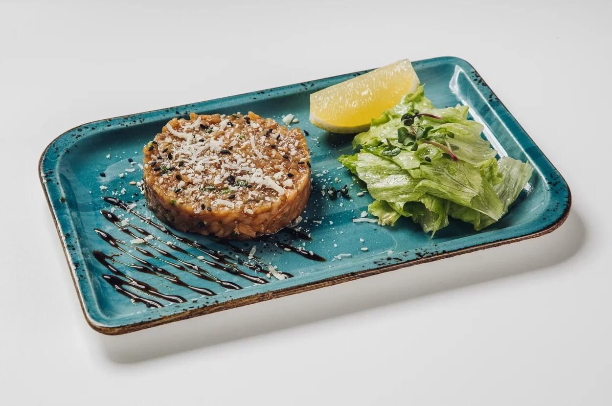 Тартар из лосося слабой солиЛосось слабой соли, лук репчатый, лук зеленый, салат айсберг, соус унаги, масло оливковое, лимон, семена кунжута, тёртый пармазанЦена: 590 рубВес:145 гр